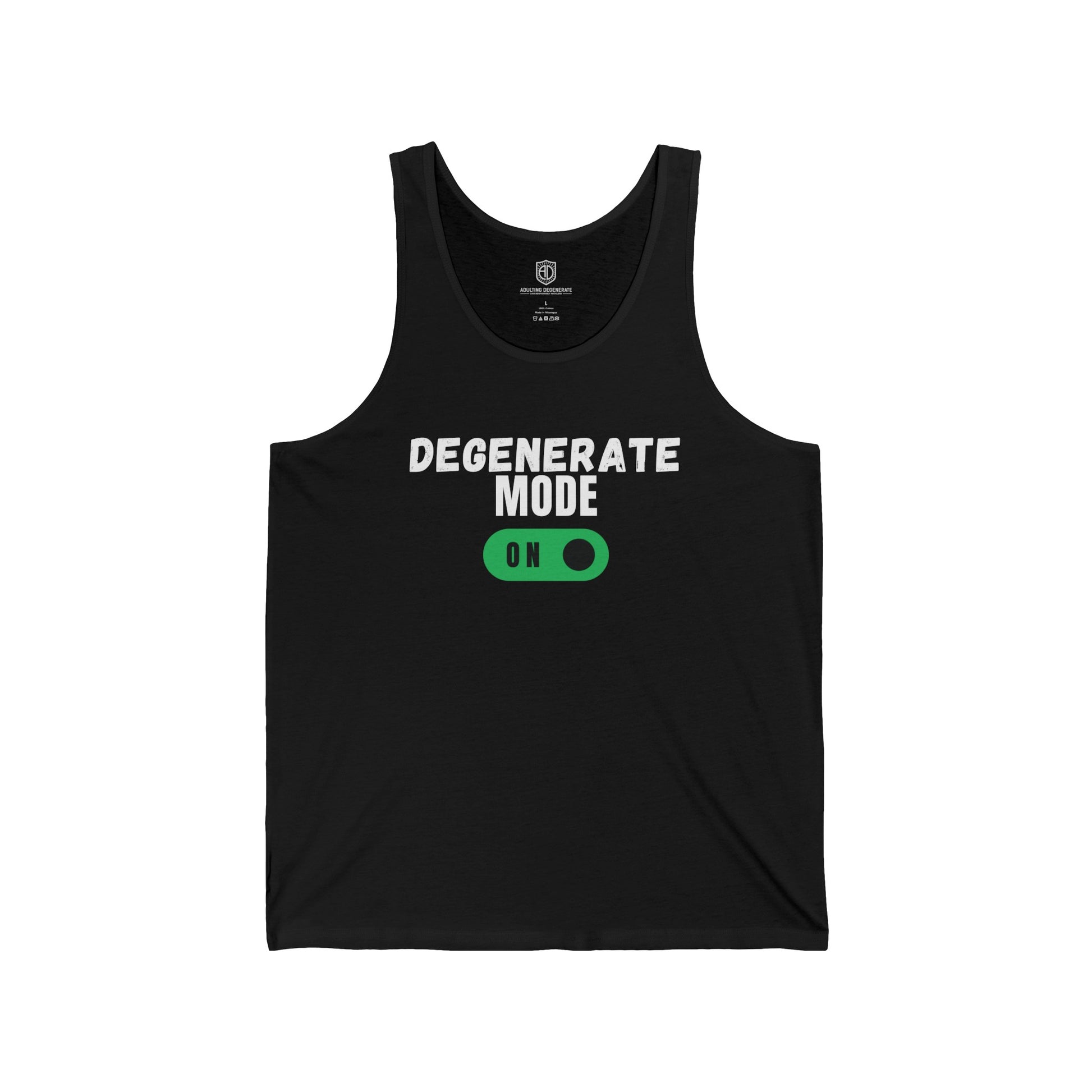 Get ready to channel your inner rebel with the Degenerate Mode On Men's Tank Top. This stylish tank grabs attention with its bold "DegenerateMode On" text print across the front, letting everyone know you're in fun mode.