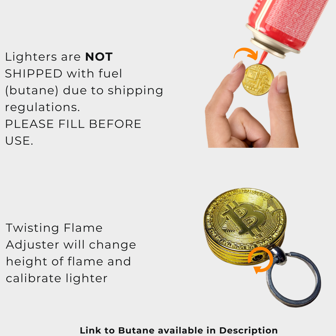 SAFETY: DOES NOT SHIP WITH BUTANE. CLICK HERE to purchase butane. This is an affordable price & will refill approx. 15 Bitcoin Lighters.